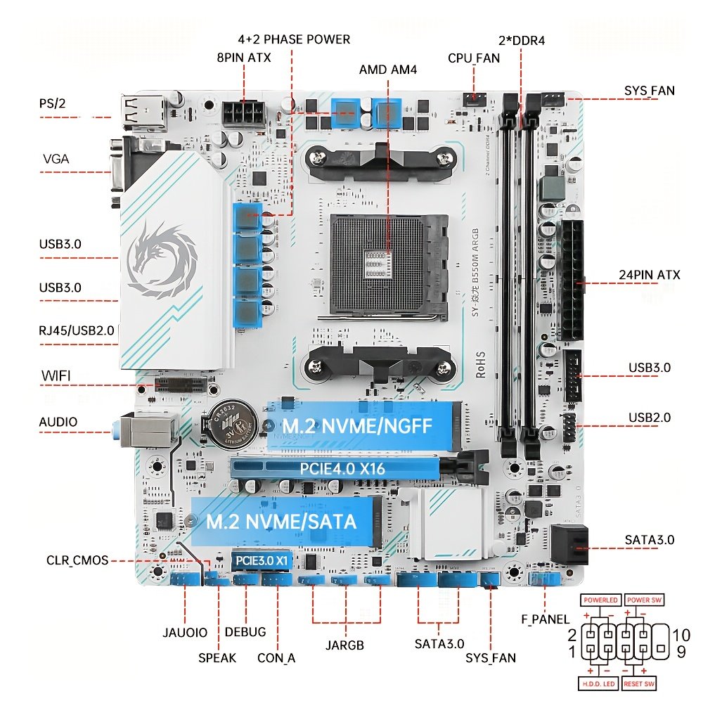 1*4Pin Speak pin; 2*5Pin COM pin; 2*5Pin Debug pin; 3*5V 3PIN ARGB pin